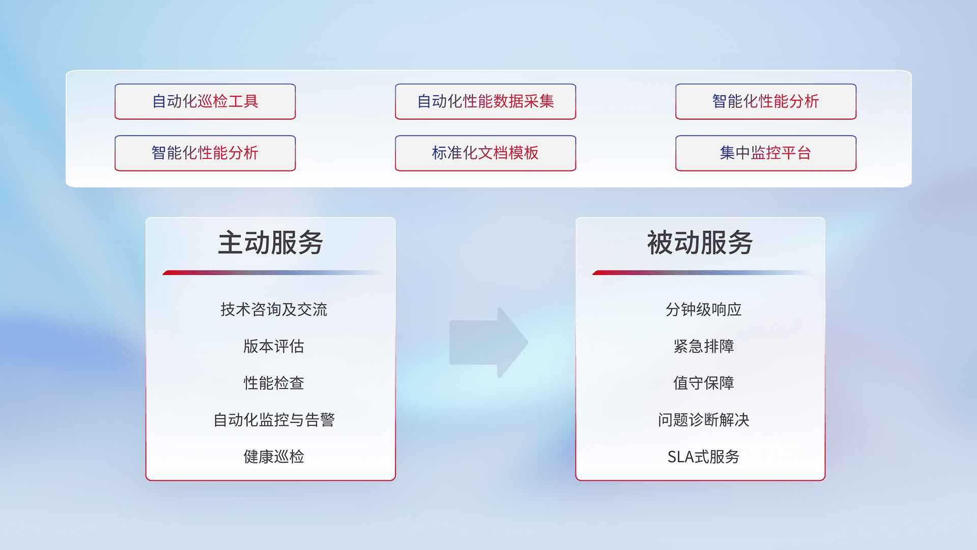 智能化工具和标准化文档,,,保障服务质量,,,,提供主动服务(包含技术咨询、、、、版本评估、、、性能检查、、、自动化监控与告警、、健康巡检)和被动服务包含(分钟级响应、、、紧急排障、、、值守保障、、、问题诊断解决、、、SLA服务)。。。